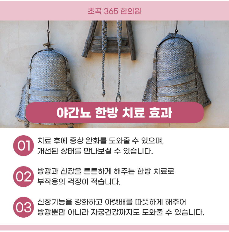 포항 야간뇨 한의원 초곡365한의원에서는 개개인의 몸 상태 및 문제가 일어나는 원인과 체질 등을 꼼꼼하게 살핀 이후 여러 치료 과정 중 개인에게 필요한 치료의 진행을 도와드림으로써 증상의 호전과 전반적인 건강 상태가 증진 될 수 있도록 도움을 드립니다. 더 나아가 재발이 잦은 야간뇨의 특성을 고려하여 꾸준한 케어를 통해 다시 나타날 수 있는 확률을 줄이고 또 다시 불편사항이 있다면 언제든지 다시금 몸에 맞는 한약이 처방될 수 있도록 도움을 드리고 있습니다. 참고 견디는 것만이 정답이 아니며 증상을 방치해두실 경우 더욱 치료의 기간이 길어지고 문제가 악화될 수 있어 니며 이상한 신호가 드러나면 되도록 빠르게 치료를 시작하시는 것이 필요합니다. 그러니 증상이 느껴지신다면 언제든지 포항 야간뇨 한의원 초곡365한의원에 내원하시길 바랍니다.