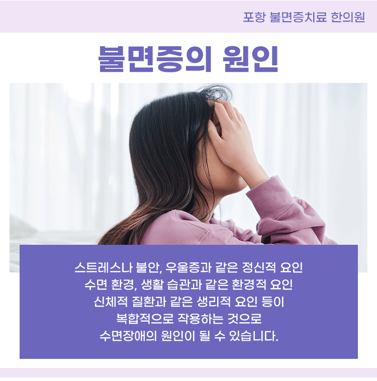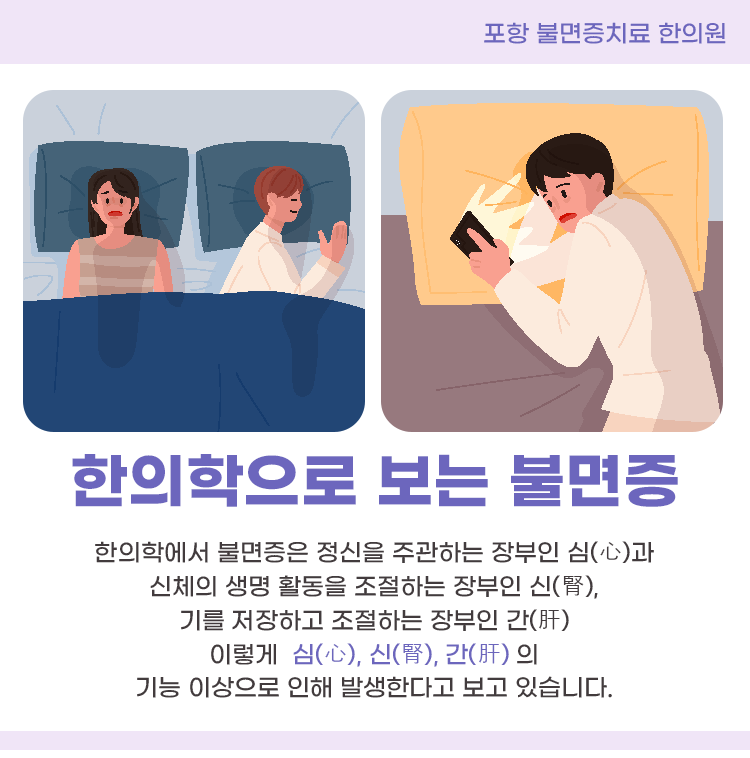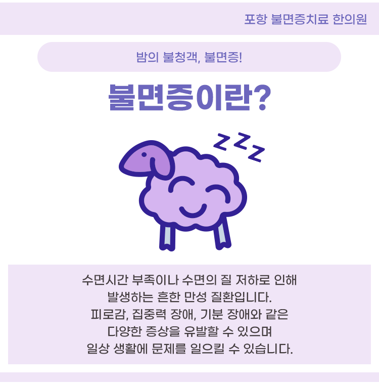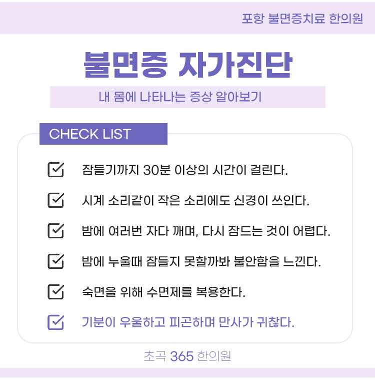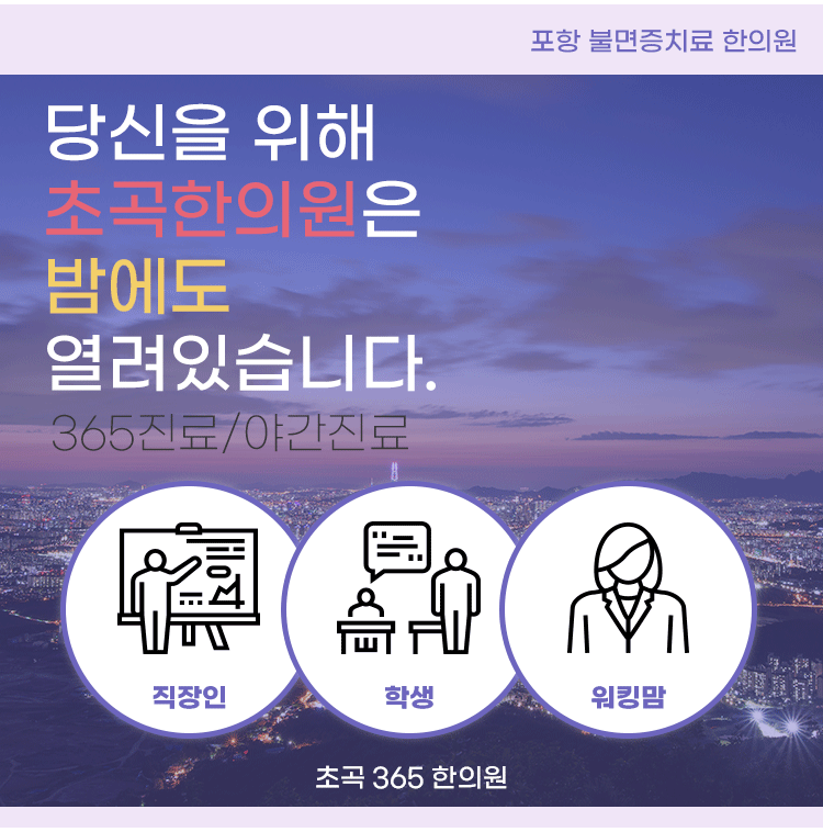 안녕하세요! 포항 초곡365한의원입니다. 많은 분들이 알고 계시는 ‘잠이 보약이다’ 라는 이 문장만 보아도, 예전부터 사람에게 잠이 얼마나 중요한 부분인지 짐작할 수 있습니다. 하루동안 소모한 에너지를 다시 보충해 주고 쌓인 스트레스를 회복시켜 주는 등 다양한 역할을 이 잠, 수면이 해결해 주고 있습니다. 하지만 잠에 들 때 까지 매일 30분 이상이 소요 되고 있거나, 얕은 잠을 자게 되면서 중간에 1회 이상 깨어나 수면 패턴이 깨지는 상황을 매일 겪고 있다면 자고 일어나도 머리가 맑지 않고 피로도가 심해 일상생활에 지장을 주는 상황을 마주하게 됩니다.