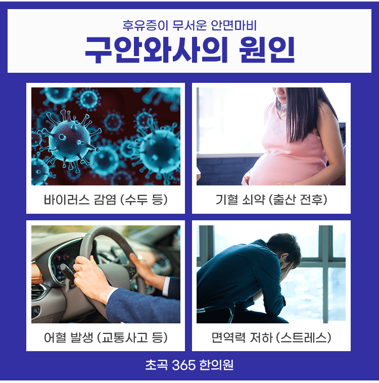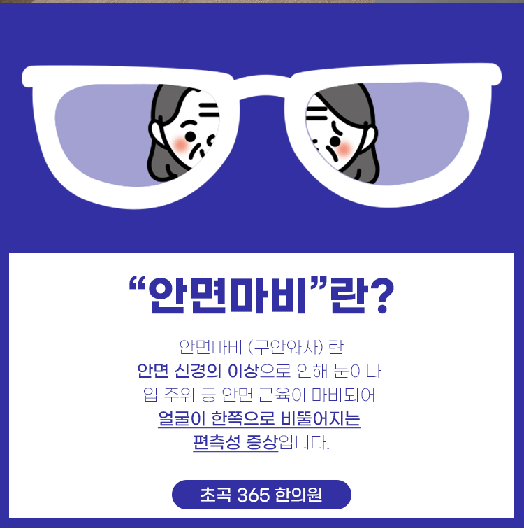 안녕하세요 포항 안면마비 한의원 초곡365한의원입니다. 갑자기 얼굴 한쪽이 움직이지 않고 양쪽이 다르게 삐뚫어진다면 누구든지 당황할 수밖에 없을텐데요. 이렇게 안면 신경에 이상이 생김으로 인해 근육에 마비가 나타나고 얼굴 근육이 위축되는 등 경련이 일어나게 되는 것을 보통 구안와사라고 얘기합니다. 구안와사는 눈이 잘 감기지 않고 입이 비뚤어지는 등 얼굴이 이상해지는 특징을 보이는데요, 이를 계속해서 방치할 경우 2차적인 질환까지 초래할 수 있어 주의하셔야 합니다.