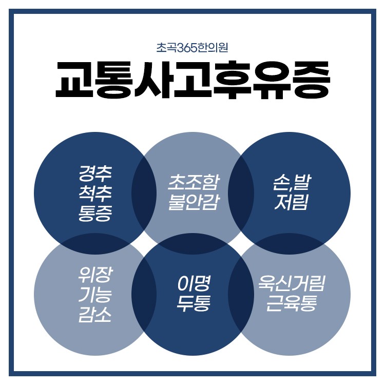 대표적인 교통사고 후유증으로는 근골격계, 전반적인 신체기능 저하, 정서적 증상, 어혈 등의 문제가 발생할 수 있습니다. 어혈은 외부 충격으로 인해 생기며 원활한 혈액순환을 방해하여 다른 질환을 유발합니다. 그러므로 어혈 제거를 통해 혈액순환을 원활하게 하며 신체를 올바르게 다스리는 것이 중요합니다. 근골격계의 손상은 근육과 인대, 골절, 디스크 등의 통증을 말합니다.
