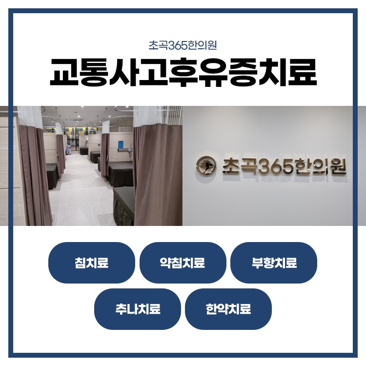 교통사고 후유증뿐만 아니라 모든 질환이 방치하면 안 좋은 결과를 낳게 됩니다. 그러므로 초기 진료가 중요하다고 말씀드립니다. 초곡365한의원에서는 후유증을 개선하기 위해 침 치료, 약침 치료, 부항 치료, 추나요법 등을 진행하고 있습니다. 환자의 증상과 정도에 따라 적절한 치료법을 시행합니다.
