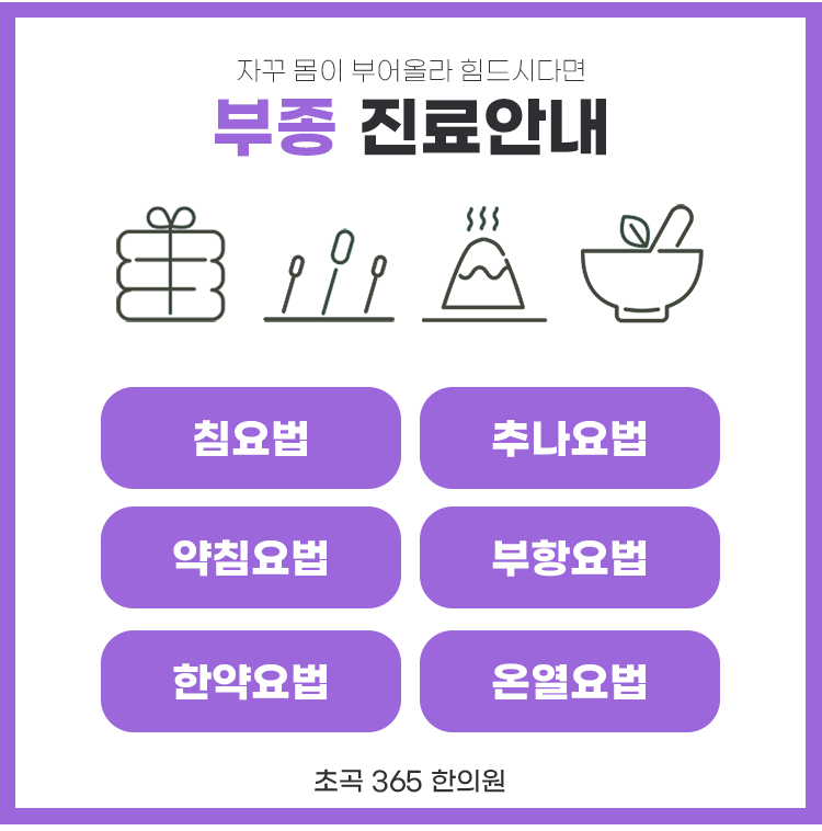 부종 증상에 대해 한방치료는 하지 혈액순환을 증가 시키고 근육을 풀어주어 하지통과 붓기를 해결하는 효과가 있어 통증을 완화시키고 편안한 일상으로 돌아가는데 더욱 큰 도움이 되어 줄 것입니다. 아무래도 현대인의 식습관 및 생활습관으로 인하여 부종이 생기는 경우가 많은데요. 특히나 무리한 다이어트나 급격한 체중증가로 인해 발생하기도 합니다 이러한 부종은 20대에서 폐경기에 접어든 여성분들이 주로 발생하는만큼 평소에 붓기나 저림으로 고생하고 있으신 분들이라면 꼭 한번 포항 초곡365한의원으로 내원하셔서 자세한 상담과 치료를 권장드립니다.