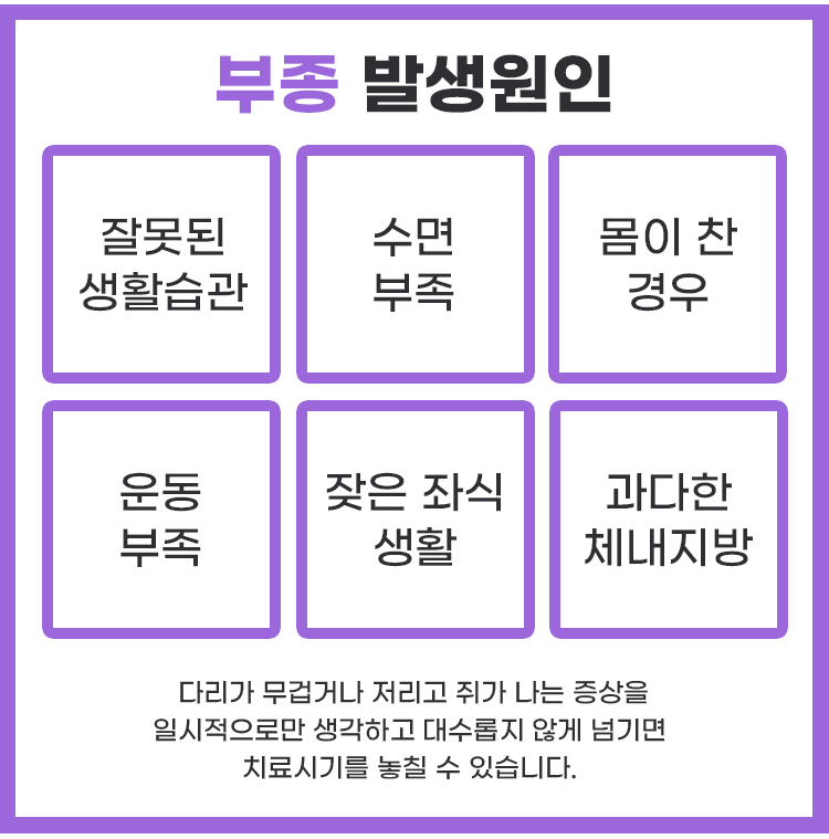 우선 '부종'에 대해서 알아보자면, 시대가 점점 바뀌고 그만큼 직종이 다양해졌기 때문에 보통 생각하지 못한 여러 분야에서 일을 하게 되는데요, 그런만큼 하루 24시간의 반 이상을 서서 일하시는 분들도 계시며 그 외에도 부종의 증상은 다양한 원인을 통해 나타날 수 있습니다 부종이란, 조직간격에 다량의 염분과 수분이 저장되는 것을 의미합니다. 이렇게 저장된 염분과 수분이 일정량을 초과하게 되면 부종을 확인할 수 있는데, 자주 접하는 중요한 증상인만큼 그에 따른 원인들도 다양합니다 신장 질환 외 심장, 간, 갑상선, 알레르기성 등에서도 부종이 발생할 수 있으며, 정상인 중에서도 식습관이나 체중 변화 등에 따라 부종이 발생할 수 있다고 합니다. 다리 부종이 나타났을때 방치하게 된다면 부종으로 의해 신염, 신증후군의 발병으로 진행될 수 있으며, 하체리만으로 이어지거나 심각한 경우에는 하지정맥류까지 생기게 됩니다.