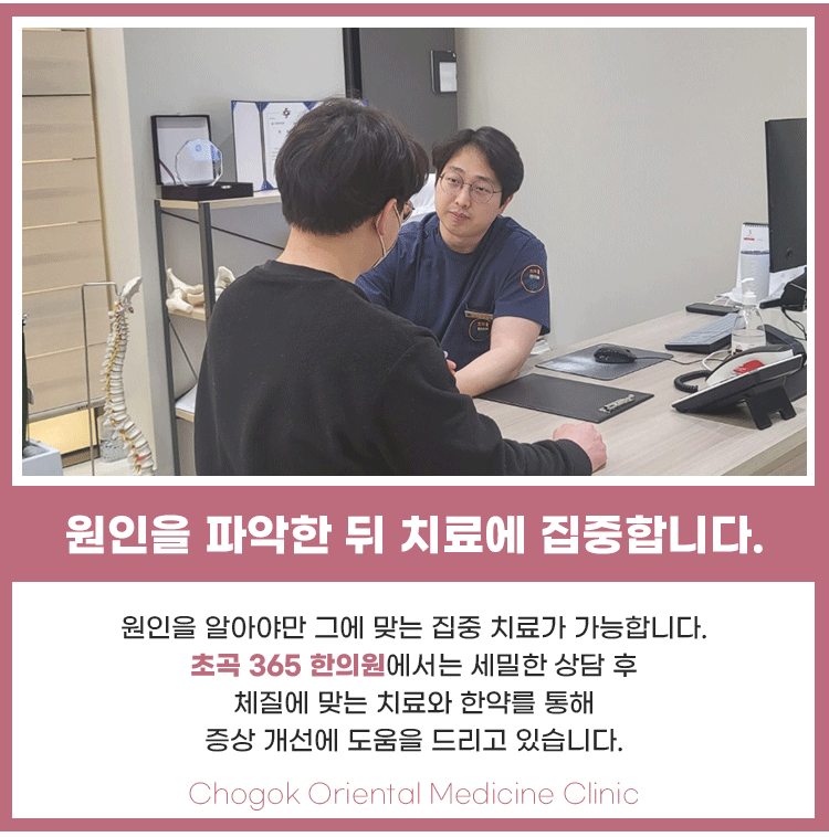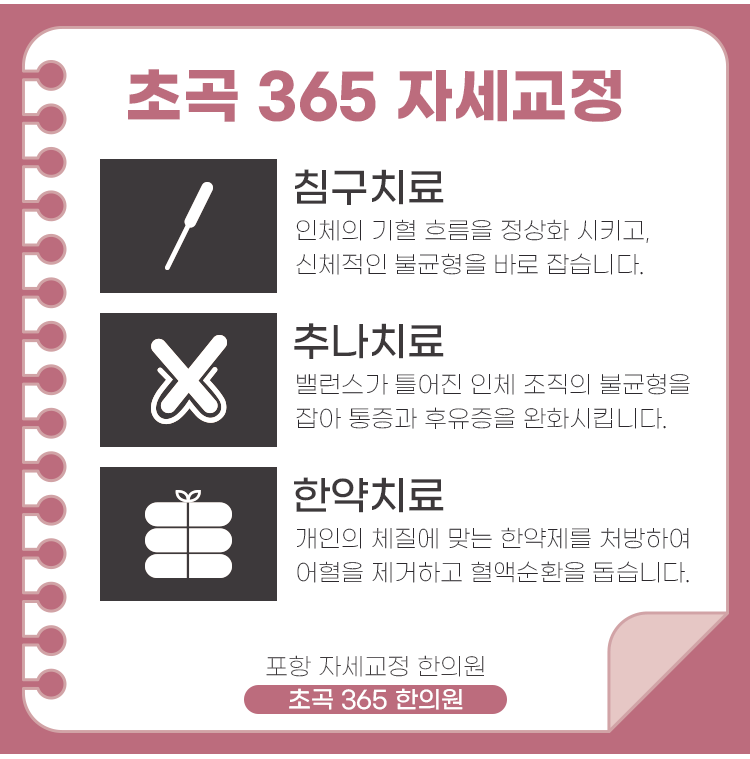 무엇보다 중요한 것은 증상이 심해지기 전에 초기에 치료를 받는 것입니다. 시간이 지나면서 저절로 좋아지는 증상은 없습니다. 통증이 심하지 않다고 방치하거나 참고 있다면 더 심한 질환으로 번지거나 심각한 경우 수술을 해야 되는 상황이 올 수도 있습니다. 그러니 상태가 더 심각해지기전에 포항 초곡365한의원에 내원하여 적극적으로 치료를 받으시기를 권유드립니다.
