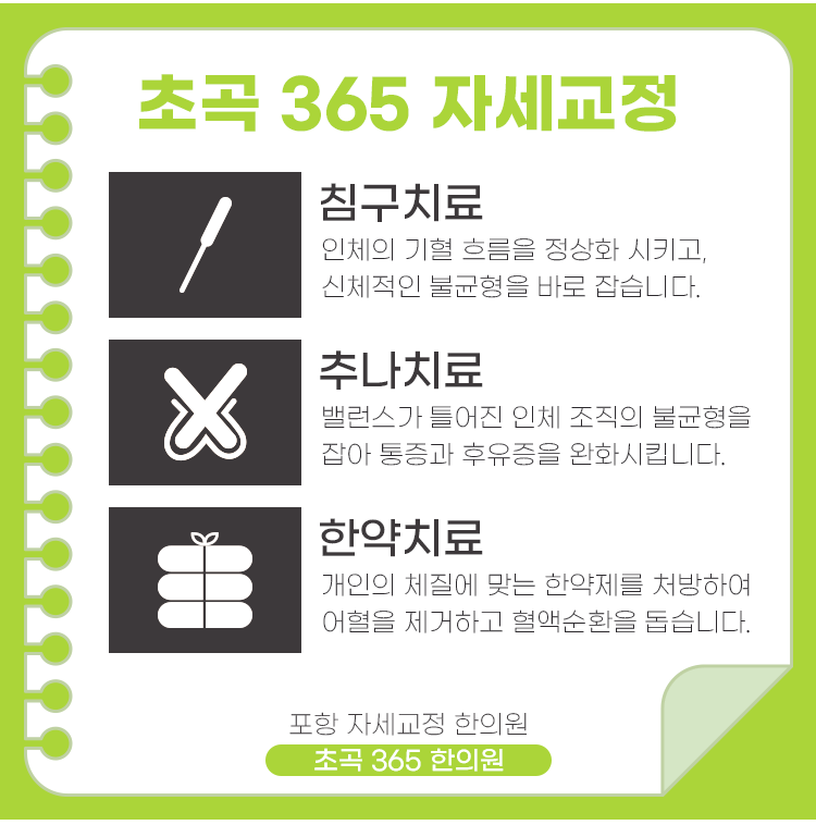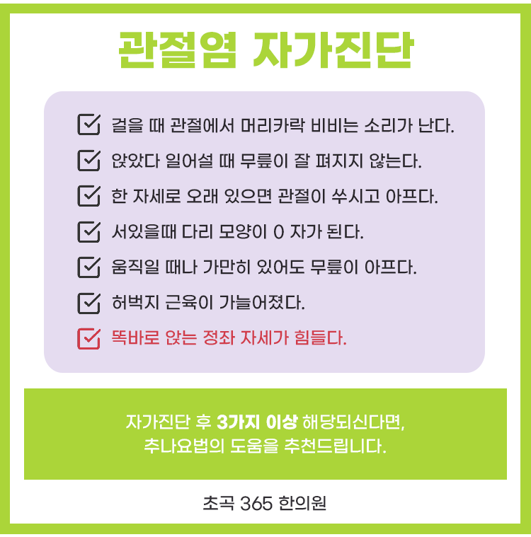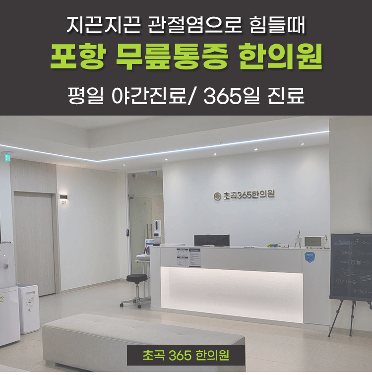 관절염 정도가 심하다면 포항 초곡365한의원에 내원하셔서 꾸준히 치료받으시길바랍니다. 걸을 때, 앉았다 일어날때 등 무릎이 쑤시고 아프다면 방치하지 마시고 편안한 일상을 되찾으시기 위해 초곡365한의원의 도움을 받아보시길 바랍니다. 포항 초곡365한의원에서는 365일 쉬지않고 매일 진료를 보고있습니다. 평일 야간진료와 주말,공휴일 진료를 통해 바쁜 일상 속에서도 언제나 편한 시간대에 내원하여 꼼꼼한 진단과 치료를 받으실 수 있으니 통증으로 고통받고 계시다면 언제든지 편하게 내원해주시길 바랍니다.