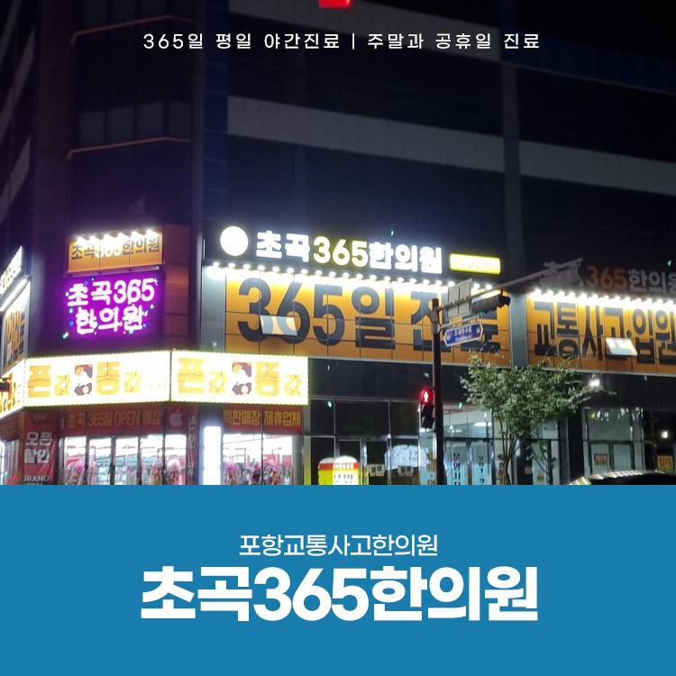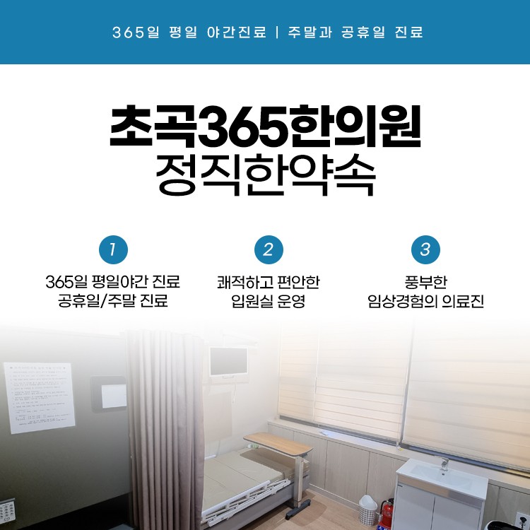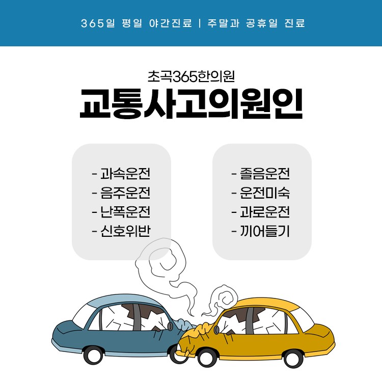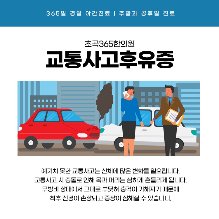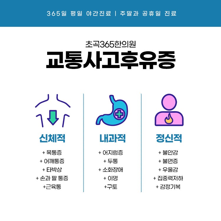 초곡365한의원에서는 교통사고 후유증에 대한 체계적인 치료계획을 수립할 뿐 아니라 여성질환, 근골격계 질환, 호흡기 질환 등 다양한 진료과목을 보고 있습니다. 매일 쉼 없이 평일 9시까지 야간진료를 보고 있으며 공휴일과 주말에도 진료를 시행하고 있습니다.