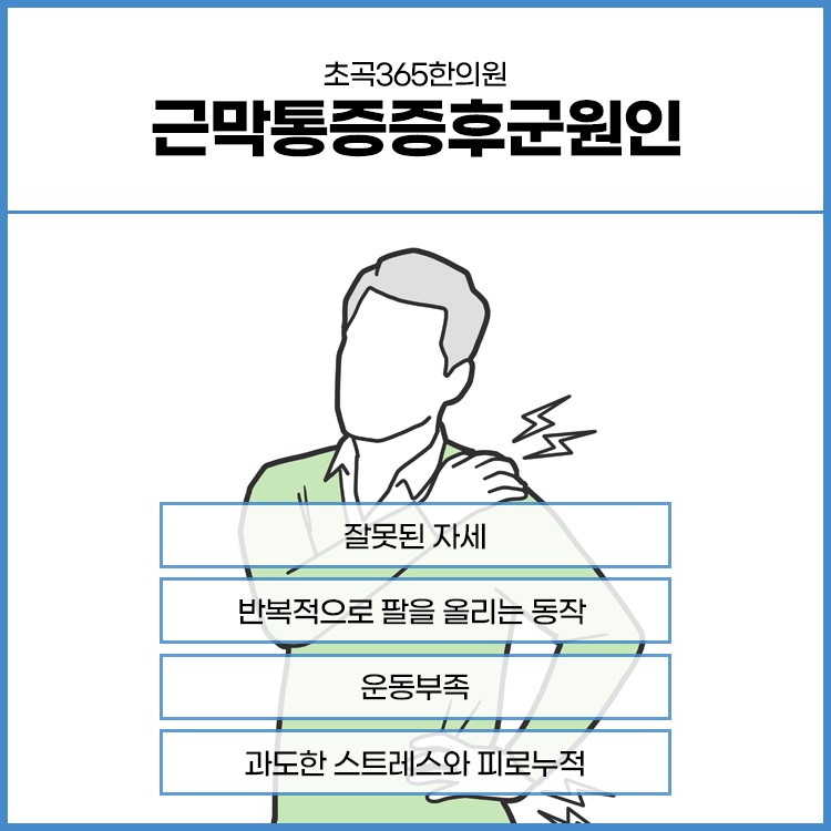 근막통증증후군이 생기는 원인으로는 무리하게 운동하거나 잘못된 자세를 장기간 유지하거나 지속해서 긴장 상태이거나 스트레스, 운동 부족 등으로 인해 생길 수 있는 질환입니다. 나이를 불문하고 누구에게나 생길 수 있는 질환이기 때문에 항상 주의해야 합니다.