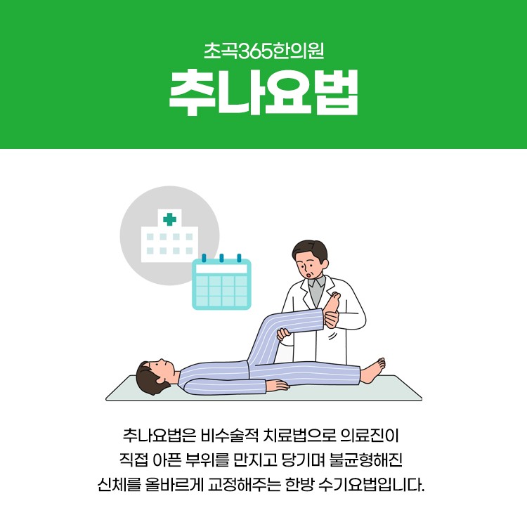 요통 치료에는 다양한 방법들이 있지만 많은 분이 만족해하시는 방법에는 추나요법이 있습니다. 추나요법은 비수술적 치료법으로 의료진이 직접 아픈 부위를 만지고 당기며 불균형해진 신체를 올바르게 교정해주는 한방 수기요법입니다.