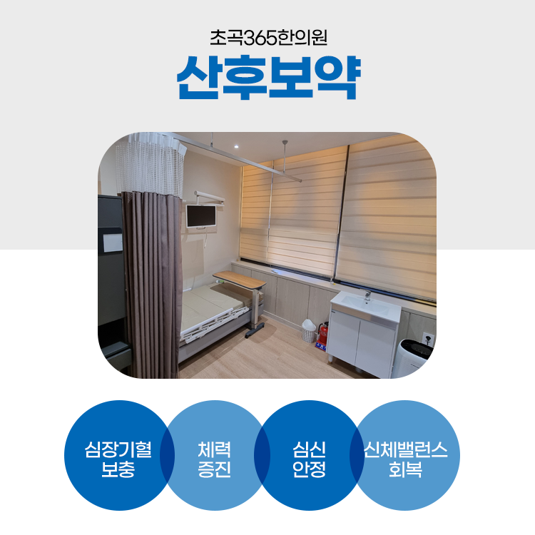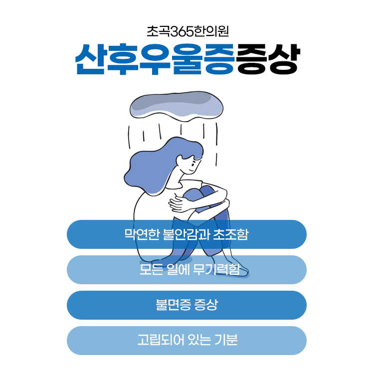 무엇보다 가까이 있는 아이에게 부정적인 정서를 끼친다든가 불안정한 애착 관계가 형성되는 등 앞으로 성장에도 중요한 부분입니다. 초곡365한의원에서는 산후우울증과 산후풍에 대한 증상을 개선해 드리기 위해 유형별로 맞춰 한방치료를 진행하고 있습니다.