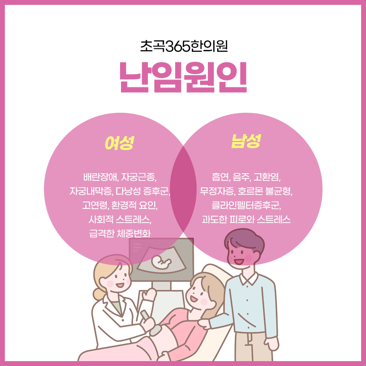 남성의 경우 정자의 활동력이 떨어지거나 정자 수가 부족한 경우, 생식기능 이상, 면역학적 이상, 음주, 흡연, 스트레스 등이 대표적인 원인으로 보며 여성의 경우는 자궁내막증, 다낭성난소증후군, 생식기능 저하, 자궁내유착, 자궁근종, 호르몬불균형 등으로 인한 요인을 볼 수 있습니다. 난임은 그 누구의 잘못도 아닙니다. 부부 모두의 문제로 인해 나타난다는 것을 명심하시길 바랍니다.