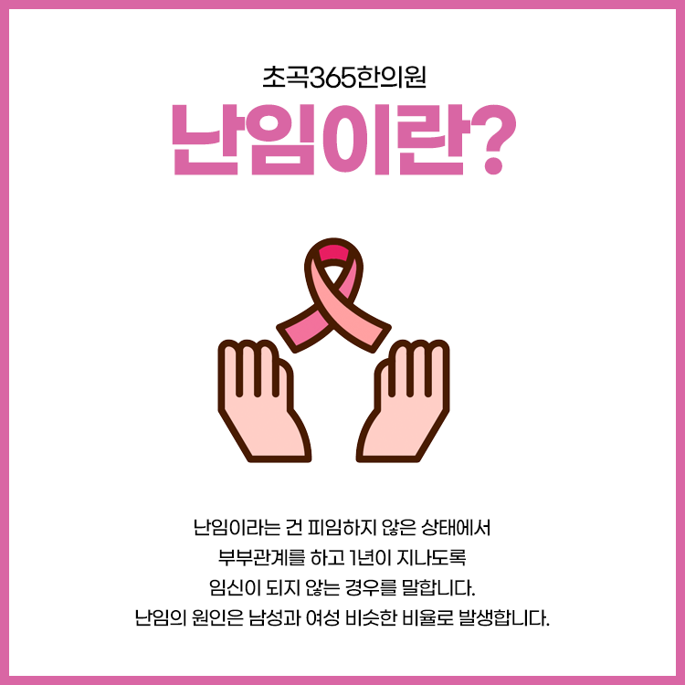 난임이라는 건 피임하지 않은 상태에서 부부관계를 하고 1년이 지나도록 임신이 되지 않는 경우를 말합니다. 난임의 원인은 남성과 여성 비슷한 비율로 발생합니다.
