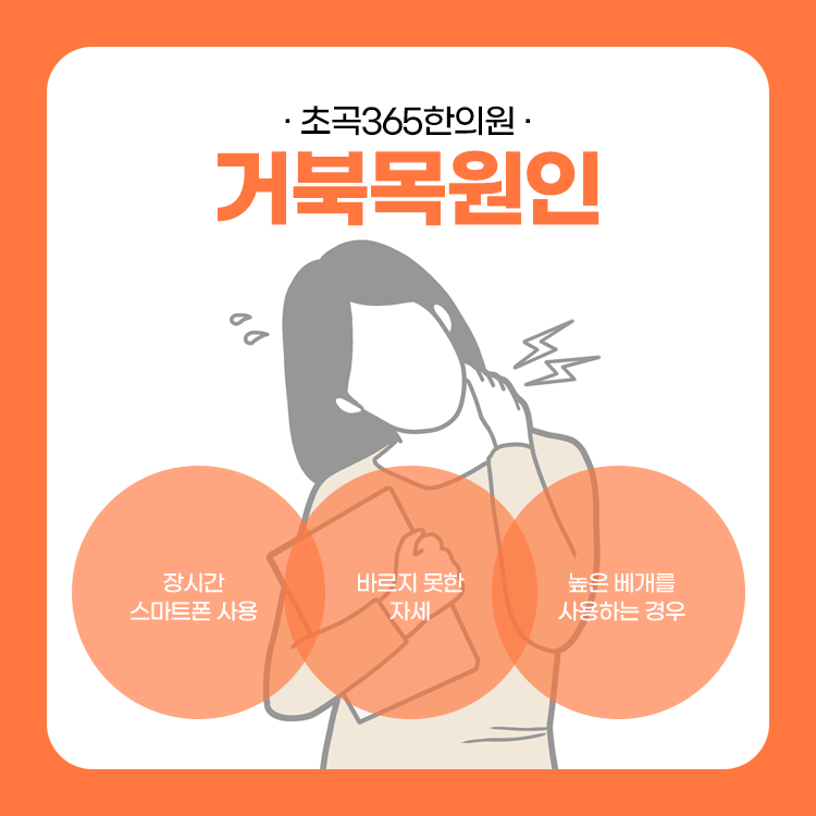 거북목이 발생하는 원인은 다양합니다. 보통 일상생활 습관이 잘못되면 발현되기 쉽습니다. 장시간 스마트폰을 목을 쭉 뺀 채로 사용하거나, 등을 굽히는 자세를 유지하거나, 목에 맞지 않는 높은 베개를 사용하거나, 턱을 괴는 습관, 오래 앉아 생활하는 습관 등입니다. 연령층과는 무관하게 앉아서 일하는 환경에 있어야 한다면 누구에게나 일어날 수 있다는걸 잊어서는 안 됩니다.