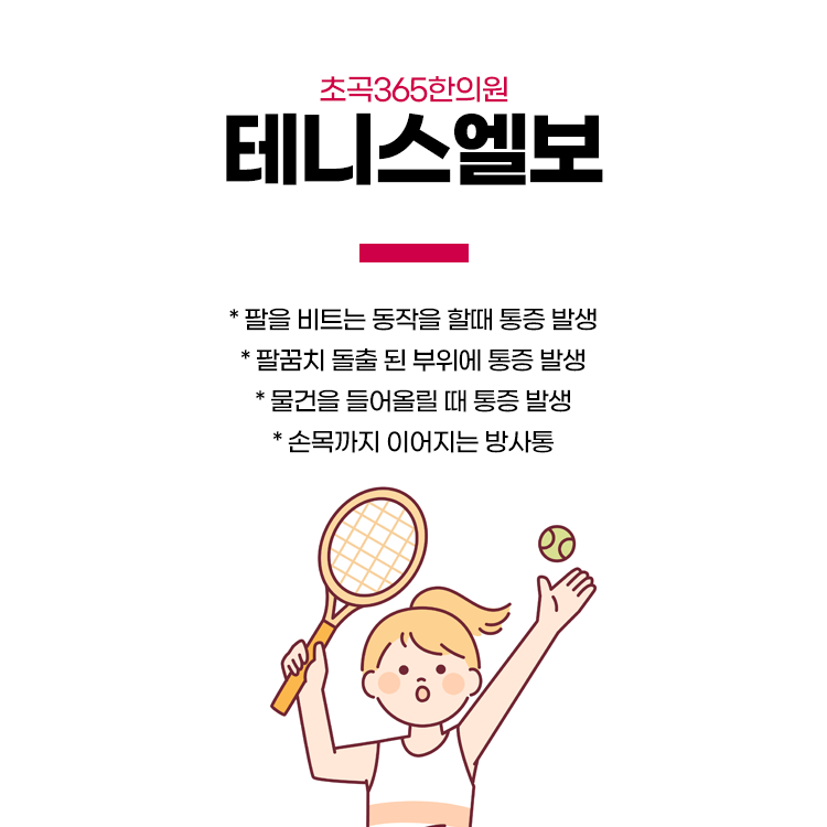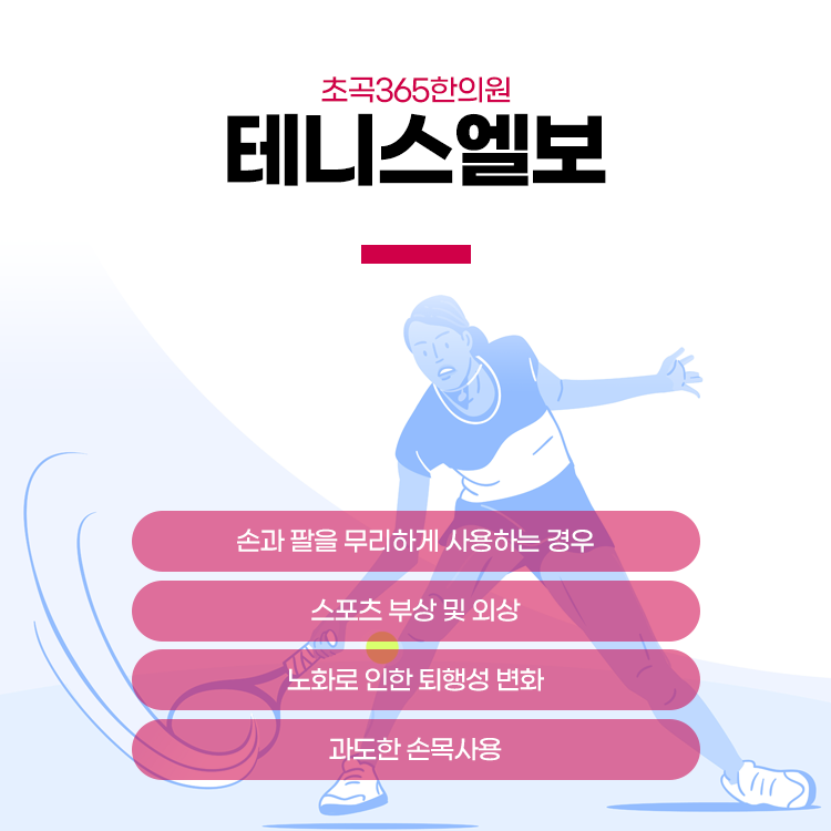테니스엘보는 손목을 무리하게 사용하면 발병할 수 있습니다. 충분히 휴식을 취하면 호전되기도 하지만 통증이 심하거나 오랫동안 지속된다면 만성화로 이어질 수 있습니다. 테니스나 골프를 할 때 팔에 지속해서 충격이 가해지는 운동을 즐겨하는 분들에게 자주 발생합니다.