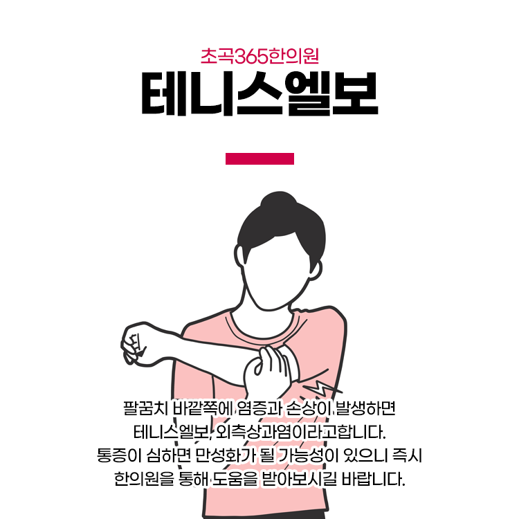 운동을 하는 것만으로 발병하는 것이 아니라 그 외 다양한 요인으로 인해 발생할 수 있다는 점 인지하시길 바랍니다. 테니스엘보는 팔꿈치에 지속해서 통증이 가해지고 손바닥을 위로 향하게 한 후 팔꿈치를 누르면 통증이 생깁니다. 젓가락를 쥘 때도 아프고 머리를 감으려고 하면 통증이 생기는 등의 증상이 발현됩니다.