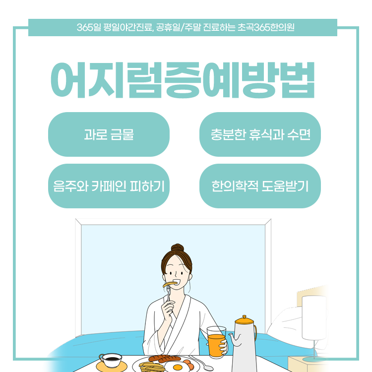 초곡365한의원에서는 개인 체질과 증상, 원인을 바탕으로 하여 환자분에게 맞는 한방치료를 진행하고 있습니다. 한약 치료, 추나 치료, 침 치료 등 몸 상태와 증상, 체질을 고려하여 알맞은 방법을 시행합니다. 가장 중요한 것은 어지럼증은 다양한 질환에 의해 나타날 수 있기 때문에 자세한 분석을 통해 개인 증상과 원인에 맞춰 다뤄져야 합니다.