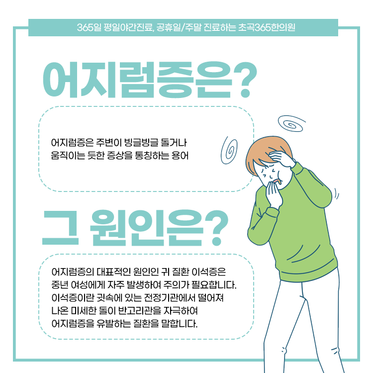 우리 귀 안쪽에는 내이 평형기관에 작은 돌인 이석이 있습니다. 이석이 제자리에서 이탈하면서 뇌에 영향을 주어 주변이 빙글빙글 도는 것 처럼 느껴지는 현상을 이석증이라 합니다. 이석이 본래 위치에서 벗어난 원인에 대해서는 확실하게 알려진 바는 없지만 외부의 충격, 골밀도감소, 바이러스감염 등으로 나타나기도 합니다.