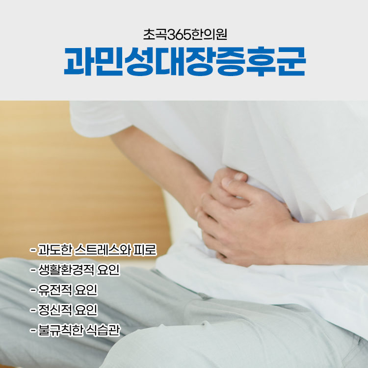 이 밖에도 체질적으로 위장기능이 약하거나 스트레스에 민감하다면 과민성대장증후군을 겪을 수 있습니다. 장의 기능적 문제를 살펴보고 개인에 따른 원인을 파악하여 한방치료를 진행하게됩니다. 개인마다 다른 증상과 원인을 살펴보고 초곡365한의원의 한약을 통해 약해진 장 기능을 높일 수 있습니다.