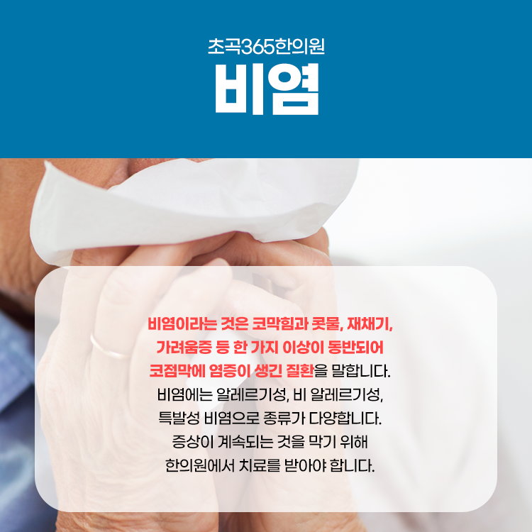 비염은 비강점막에 염증이 나타나는 염증성 질환입니다. 콧물과 코막힘, 재채기, 가려움, 두통, 만성피로 등의 증상을 유발합니다. 비염은 알레르기성과 만성으로 나눌 수 있습니다. 알레르기 비염은 특정 항원에 노출되면서 면역반응이 원인이 되어 발생합니다.