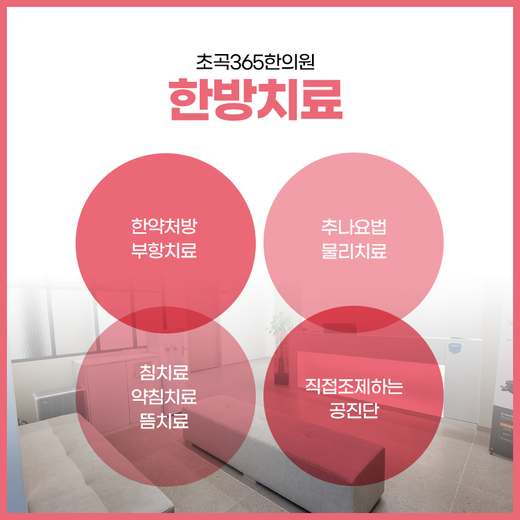 추나요법은 환자의 몸상태와 체질 등을 파악한 후 필요에 따라 한방치료도 병행하게됩니다. 한방치료를 병행한다면 더욱 빠른 개선을 기대할 수 있습니다. 한방치료에는 침치료, 약침치료, 뜸치료, 한약치료 등이 있으며 적극적으로 받아보시길 바랍니다. 눈에 보이는 증상만을 개선하는 것이 아니라 신체 내부적으로 어떤 것이 문제가 되는지 면밀하게 파악하여 완전한 개선을 돕고있습니다.