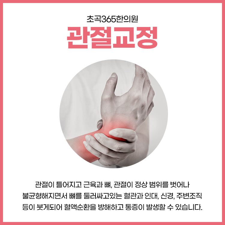 포항초곡 관절교정 한의원에서는 이러한 관절교정을 위해 알맞은 치료를 도와드리고 있습니다. 우리 몸에 나타난 통증과 문제는 시간이 지날수록 자연스레 치유되는 것이 아니라 증상이 점점 악화되고 극심해져 디스크 질환으로 이어질 수 있기 때문에 각별한 주의가 필요합니다. 가급적이면 빠른 시일내에 초곡365한의원에 내원하셔서 적절한 치료를 시작하시길바랍니다.