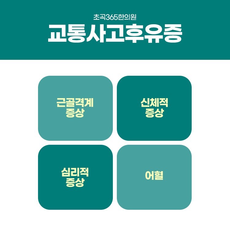 교통사고의 후유증은 사람마다 다를 것이지만 어지러움이나 두통 그리고 근골격계 통증을 느끼는 경우가 많으시며 이 뿐만 아니라 심리적 문제를 동반하게 되는 경우도 있는데요. 불안함, 초조함, 두근거림 등 불안하고 두근거림이 심해서 밤에 잠들지 못해 수면장애를 초래하게 될 수도 있고 후유증이 발생하게 되는 이유도 다양하겠지만 혈관 내부 출혈로 인해 발생하게 되는 어혈은 몸 곳곳을 돌아다니면서 여러가지 질환들을 불러일으킵니다. 어혈에 의한 후유증이라면 어혈을 제거해서 기혈을 원활히 순환시켜주는게 중요하다고 볼 수 있겠습니다.