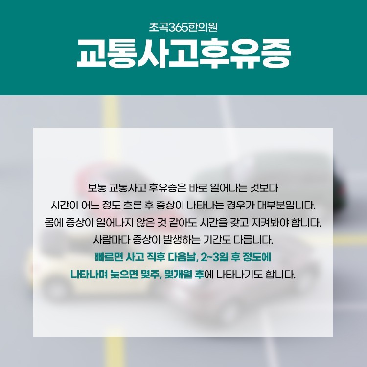 교통사고의 후유증은 보통 바로 나타나는 것 보다는 시간이 흐른 뒤에 증상이 발생하는 경우가 대부분이기도 합니다. 몸에서 증상이 나타나지 않아도 시간을 가지면서 지켜봐야 하는데 사람마다 증상이 나타나는 기간도 다른데요. 빠르다면 사고 직후에 혹은 다음날 그리고 2~3일 이후 정도에 나타날 수 있고 늦어지면 몇주 혹은 몇개월 이후 발생될 수 있습니다.