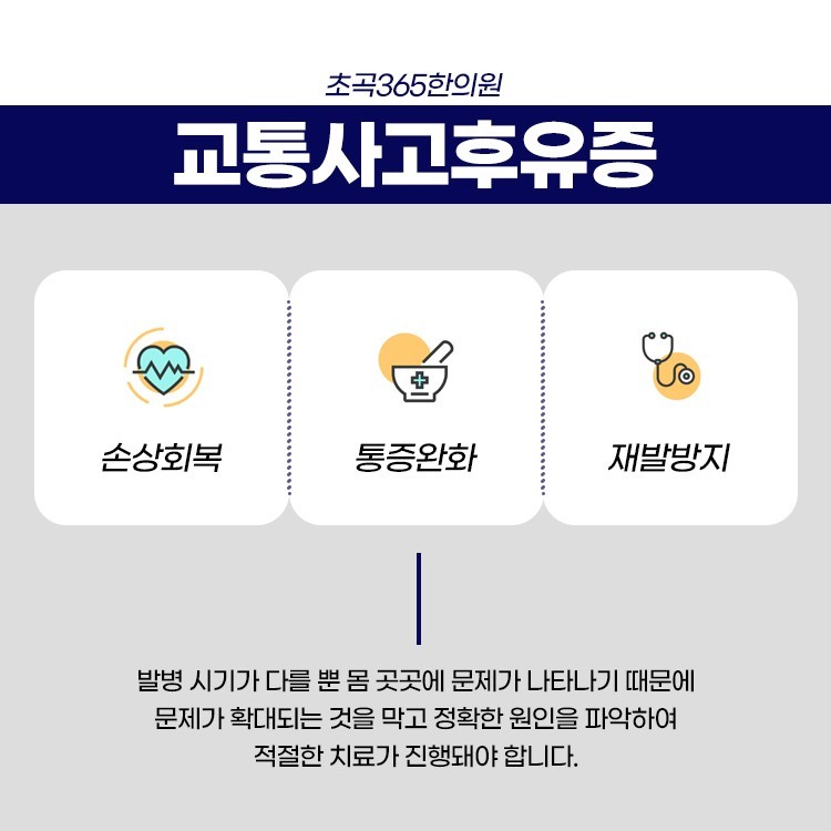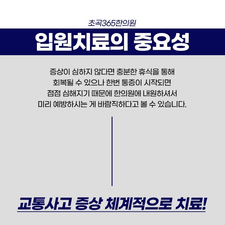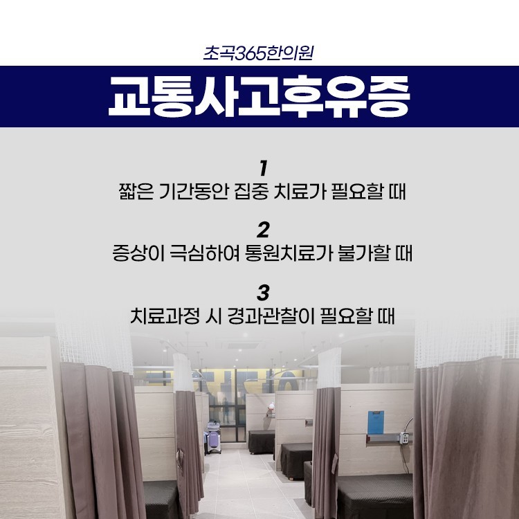 초곡365한의원은 여러가지 한방요법으로 교통사고 후유증 처방을 진행합니다. 바빠서 시간을 내보기가 힘든 분들을 위해 매일 평일 야간진료, 공휴일 및 주말 진료가 이루지고 프라이빗한 입원실도 마련되어 있는데요. 그렇기에 통증을 내버려두지 말고 몸에 이상증세가 나타났다면 포항교통사고한의원 방문을 해보셔서 검진 및 치료를 받아보세요. 감사합니다.