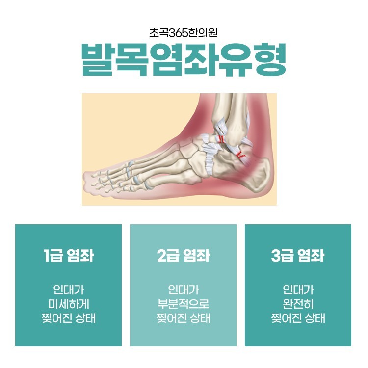 발목을 삐엇다고 표현하시는 걸 발목염좌라고 하는데 이는 발목 바깥쪽으로 3개의 인대 중 부분적으로 파열된 것을 의미하는 것인데요. 발목 인대가 약해지면 습관적으로 삐끗하게 되는데 이때 손상된 정도에 따라서 인대가 찢어지고, 출혈로 염증이 나타나기도 할 수 있으며 발목염좌는 인대 손상 정도 별로 3가지 유형으로 구분해 볼 수가 있습니다.