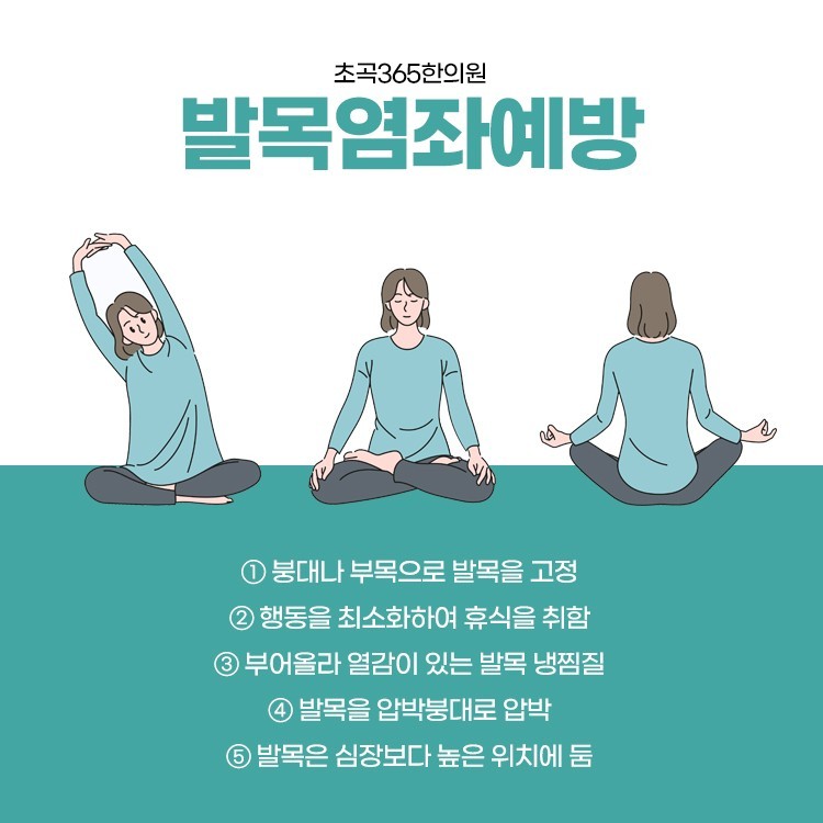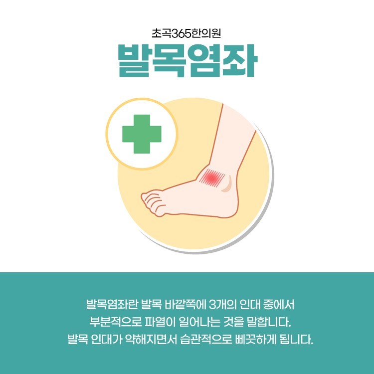 인대 구조에 무리가 갈 수 있는 운동은 삼가해주시면서 통증이 있을 땐 염증이 악화되기 전 신속한 치료가 이루어져야 할 것입니다. 초기 발목염좌는 출혈 및 염증으로 붓는 증상이 나타나며 붓기가 오랫동안 지속된다면 혈관을 압박하게 되어서 흐름을 원활히 이루어지지 못하기에 발목염좌로 인한 통증이 있을 땐 초곡365한의원을 찾아주셔서 통증 제거와 재발 방지를 진행해보세요.